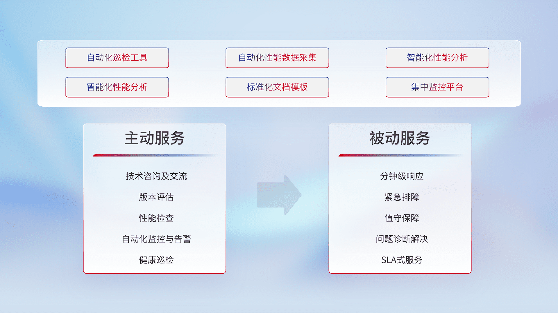 智能化工具和标准化文档,,保障服务质量,,提供主动服务(包含技术咨询、、版本评估、、、性能检查、、、自动化监控与告警、、、、健康巡检)和被动服务包含(分钟级响应、、紧急排障、、、、值守保障、、问题诊断解决、、SLA服务)。。。。
