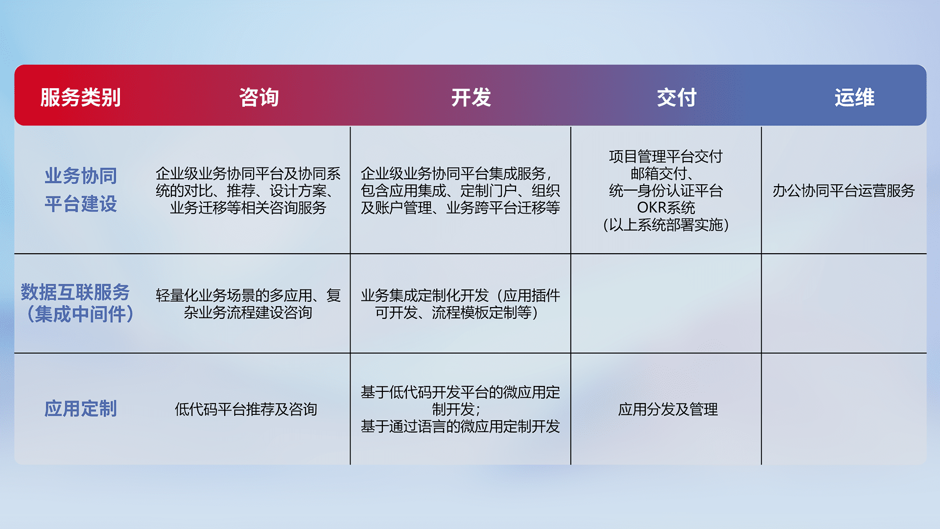 针对钉钉、、企微、、、、IDaas等平台级产品提供产品的规划、、、方案、、、交付、、定制化开发等服务,,,,实现如统一协同办公、、、、智能客户服务、、、、混合会议管理、、、、智能数据查询、、、等业务场景,,,,实现数字化转型。。。。